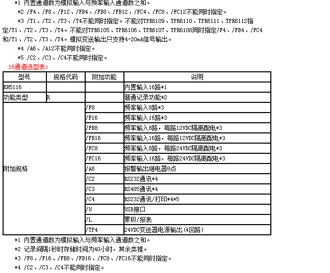 | ●報警輸出繼電器(/A6,/A8,/A12): 輸出點(diǎn)數:1~12通道:從6、12點(diǎn)中選擇。16通道:8點(diǎn)。 觸點(diǎn)類(lèi)型:常開(kāi)觸點(diǎn)。 觸點(diǎn)容量:3A/250VAC。 ●通信功能(/C2,/C3) 媒體:RS-232(/C2)或RS-485(/C3) 協(xié)議:Modbus-RTU(從機)協(xié)議 通信速率:1200/2400/4800/9600/19200/38400/57600 ●打印功能(/C4) 打印機:面板式微型打印機。(僅支持McuP系列打印機) 打印內容:實(shí)時(shí)數據、歷史數據、累積報表。 打印方式:手工打印、定時(shí)打印。 ●模擬輸出(/T1,/T2,/T3,/T4) 信號類(lèi)型:4-20mA 輸出點(diǎn)數:從1~4點(diǎn)中選擇。 輸出方式:測量通道的變送輸出。 最大負載:750Ω ●24VDC變送器電源輸出(TP4): 輸出電壓:24VDC。 額定輸出電流:4~20MADC。 最大輸出電流:65mAdc(過(guò)電流保護動(dòng)作電流:約90mA) 輸出點(diǎn)數:4回路。 |