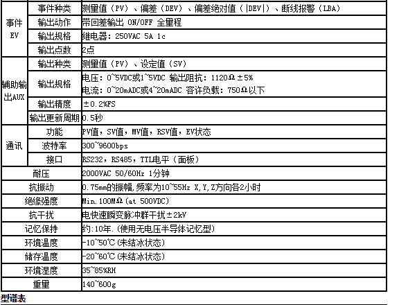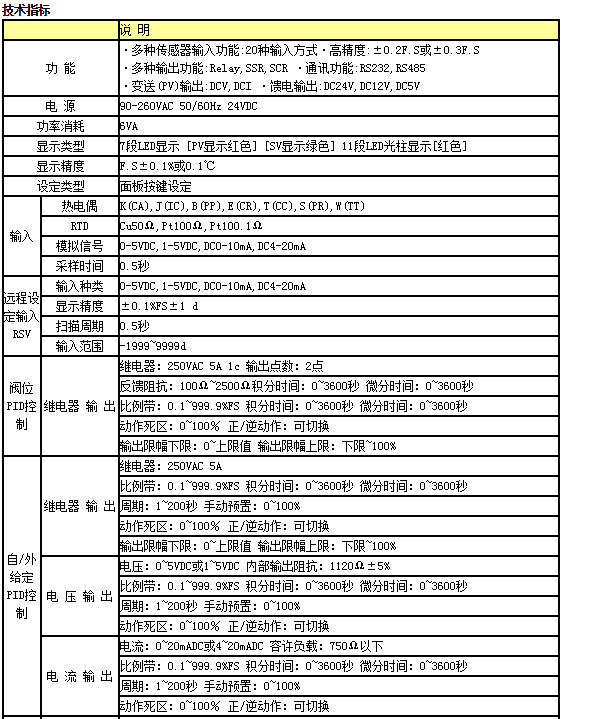 SWP-F系列人工智能調節器精度0.2%,采樣周期最短0.25秒,手/自動(dòng)切換,內給定/外給定SV切換,可設定兩種PID調節模式:TYPEA、TYPEB。事件輸出最多2點(diǎn)(偏差、PV、︱偏差︱、SV、控制輸出、馬達反饋回路、控制回路診斷報警)。它可根據SV值范圍進(jìn)行PID參數切換。它還支持RS-232、RS485通訊兼容MODBUS協(xié)議。