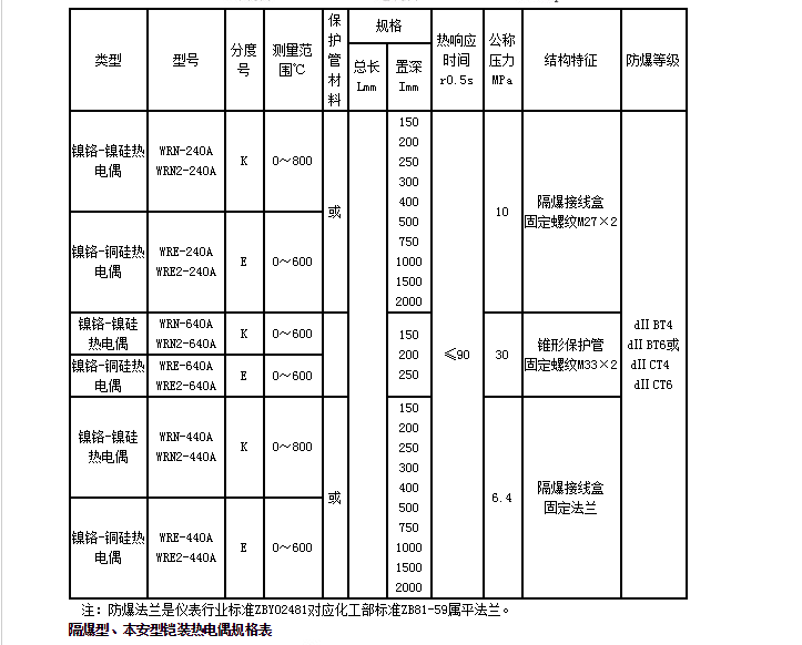 目前本廠(chǎng)生產(chǎn)的工業(yè)用隔爆熱電偶有鎳鉻-鎳硅(K型)和鎳鉻-銅鎳(E型)兩種。