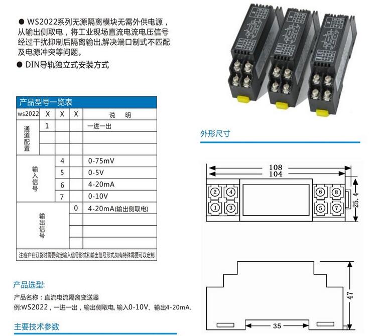 WS2022系列無(wú)源隔離模塊,無(wú)需外供電源,從輸出側取電,將工業(yè)現場(chǎng)的直流電流電壓信號,經(jīng)過(guò)干擾抑制后隔離輸出,解決端口制式不匹配及電源沖突等問(wèn)題,DIN導軌式安裝。