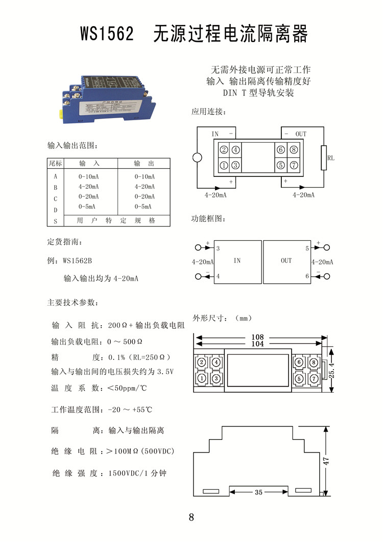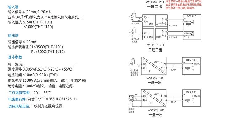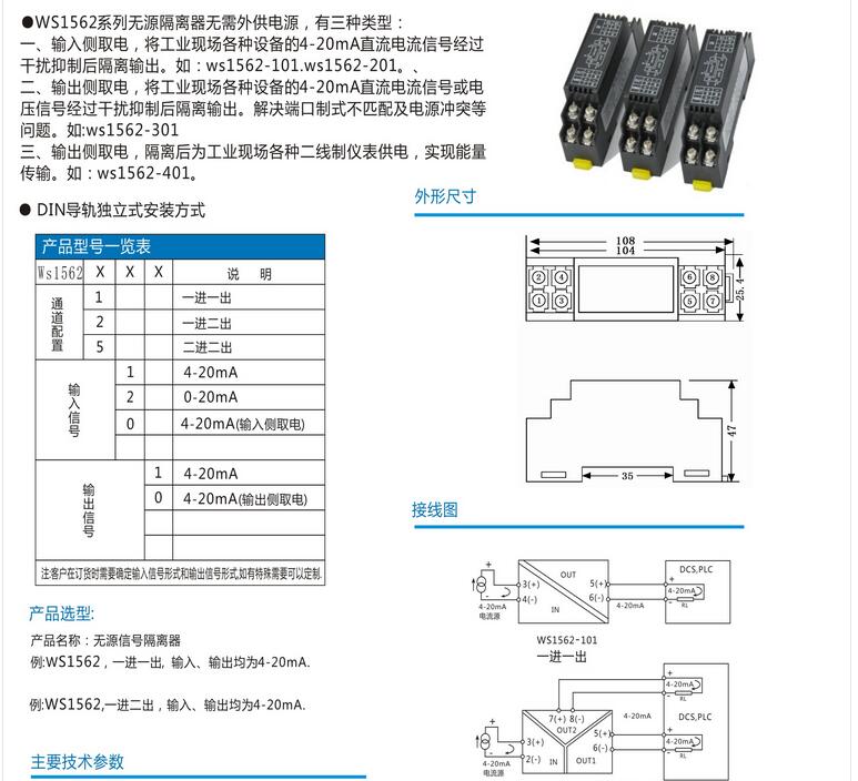 WS1562信號隔離器,無(wú)源過(guò)程電流信號隔離器4-20mA 0-20mA無(wú)需外接電源,輸入輸出隔離傳輸精度高,DIN T型導軌安裝