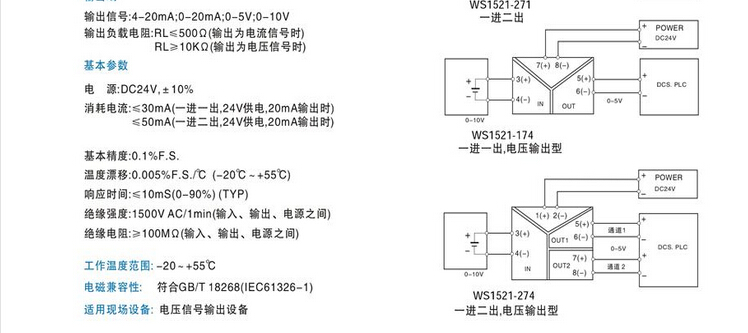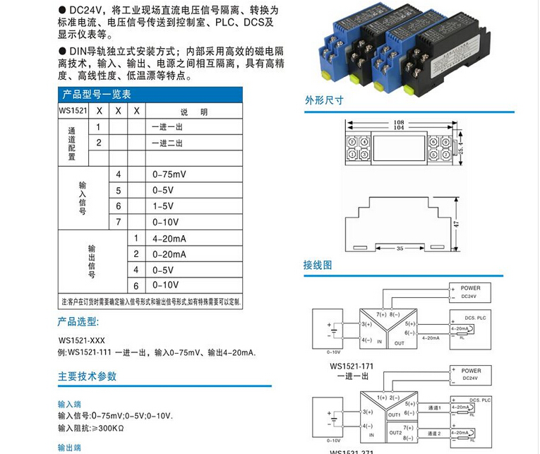 WS1521信號隔離器,三端口直流電壓隔離變送器,隔離端子。輸入、輸出、電源三端口隔離,高低電壓、高低信號多種直流信號輸入,DIN T型導軌安裝