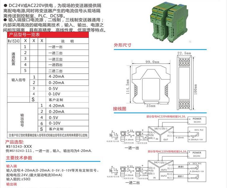 WS15243隔離柵信號隔離器,全隔離信號分配器 隔離柵,信號隔離器模塊,安全柵,電流轉換模塊。將輸入信號變換為兩路相互隔離的信號,低功耗,低熱量,低漂移,超薄DIN T型導軌安裝