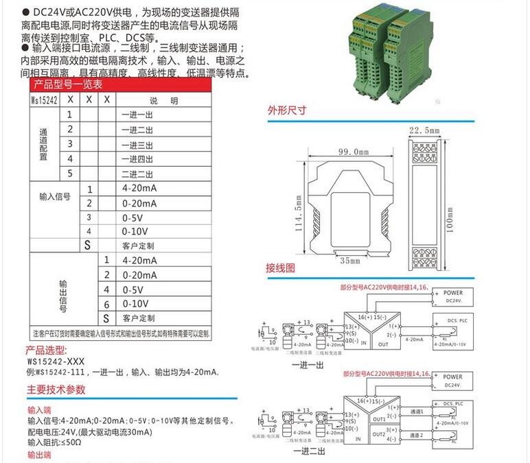 WS15242信號隔離器分配器,全隔離信號調理模塊,全隔離輸出信號分配器 安全隔離柵,信號隔離器模塊,安全柵,電流轉換模塊。將輸入信號變換為兩路相互隔離的信號,低功耗,低熱量,低漂移,DIN T型導軌安裝