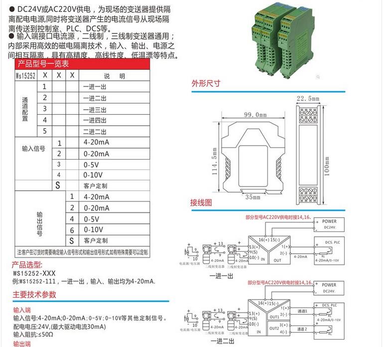 WS15252信號隔離器,全隔離雙輸出信號分配器,轉換模塊,mv、V、mA將輸入信號變換為兩路相互隔離的信號,低功耗,低熱量,低漂移,DIN T型導軌安裝