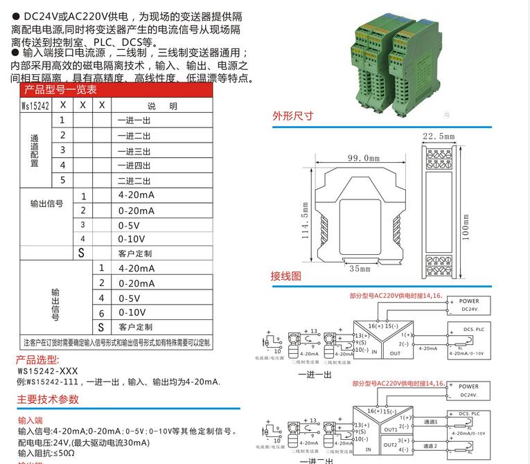 WS15242全隔離輸出信號分配器 安全隔離柵,信號隔離器模塊,安全柵,電流轉換模塊。