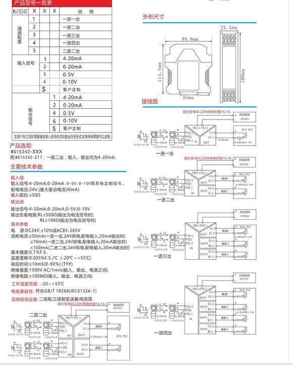 有源電流隔離器 信號分配器 詳細技術(shù)參數及接線(xiàn)方式:
