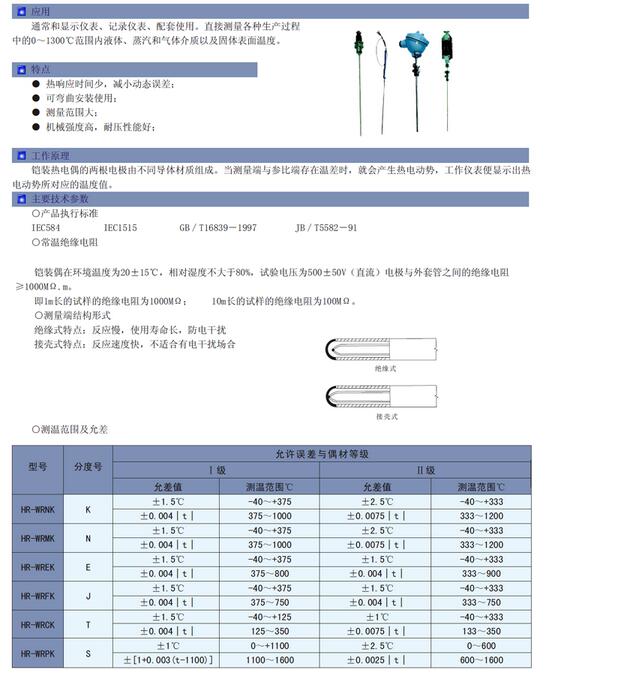 通常和顯示儀表、記錄儀表等配套使用。直接測量各種生產(chǎn)過(guò)程中的0~1300℃范圍內液體、蒸汽和氣體介質(zhì)以及固體表面溫度。