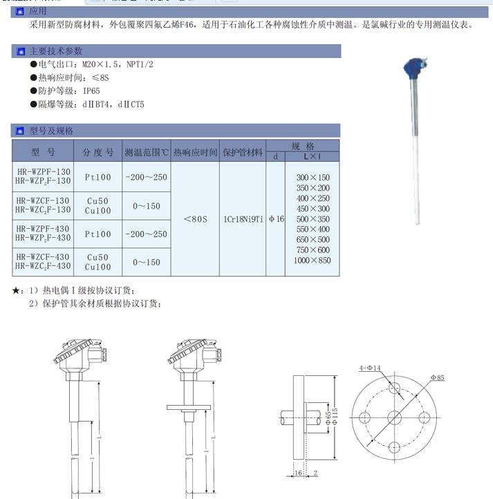 采用新型防腐材料,外包覆聚四氟乙烯F46,適用于石油化工各種腐蝕性介質(zhì)中測溫。是氯堿行業(yè)的專(zhuān)用測溫儀表
