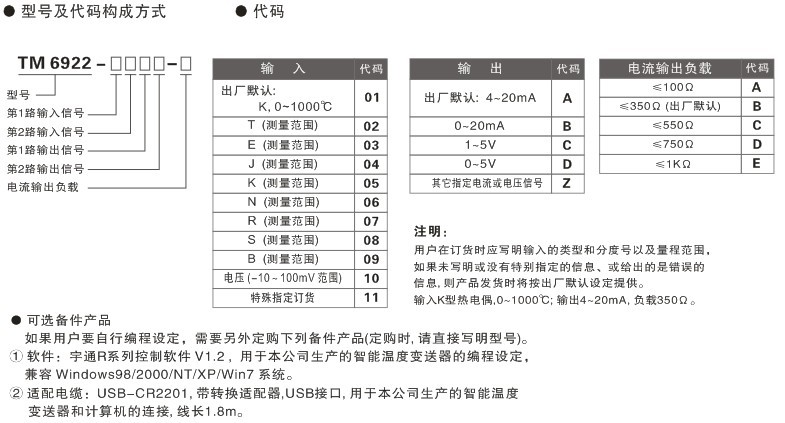 是智能型的溫度變送器, 有 USB 編程接口, 可以使用專(zhuān)用的編程電纜連接這個(gè)溫度變送器和PC機, 通過(guò)軟件在PC機上進(jìn)行編程, 可以任意編程設定熱電偶分度號和測量溫度的量程范圍。