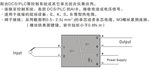 接收來(lái)自于現場(chǎng)的熱電偶信號或其它毫伏信號,經(jīng)過(guò)隔離, 轉換為固定量程的標準直流信號輸出。