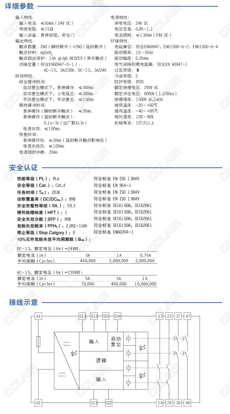 CZSR8002-2A2AT是適用于急停按鈕、安全門(mén)控開(kāi)關(guān)輸入,具有2路NO(常開(kāi))安全輸出觸點(diǎn)(瞬時(shí)斷開(kāi))和2路NO(常開(kāi))輔助輸出觸點(diǎn)(延時(shí)斷開(kāi))的安全繼電器。它可選擇單、雙通道操作,手動(dòng)或自動(dòng)復位,并具有通道間短路監控功能。