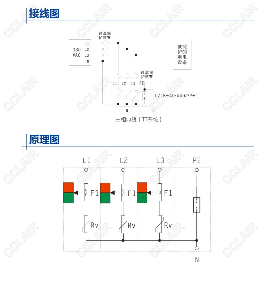 交流電源型SPD,40kA(8/20us),適合220/380VAC電源單相TT系統,安裝于防雷分區LPZ1與LPZ2