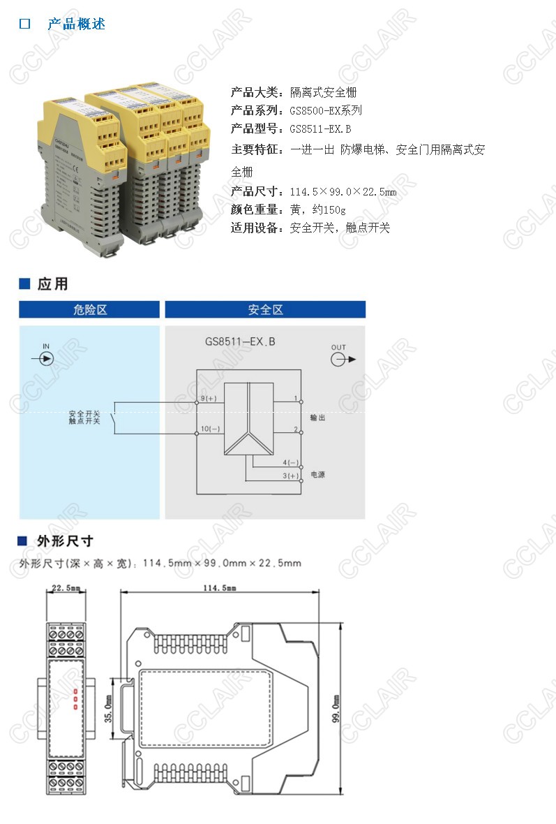 開(kāi)關(guān)量輸入隔離式安全柵,接收來(lái)自危險區的安全開(kāi)關(guān)或觸點(diǎn)開(kāi)關(guān)輸入,通過(guò)安全柵隔離傳輸到安全區輸出。輸入信號處理采用雙重冗余電路;通過(guò)通道間互相故障監測和觸點(diǎn)粘結判斷停機功能。特別適用于防爆電梯、安全門(mén)等防爆設備的安全開(kāi)關(guān)信號的監控處理。