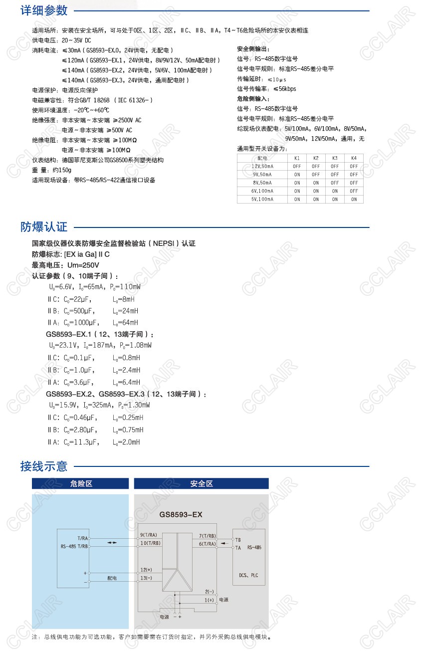 8V/9V/12V、50mA配電;該產(chǎn)品需要獨立供電,電源、輸入和輸出三隔離。實(shí)現RS-485數字信號在危險區和安全區的雙向通信,并給現場(chǎng)儀表提供隔離電源