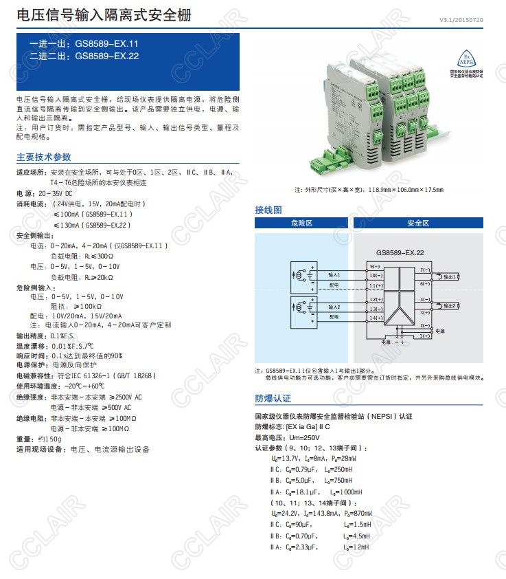 電壓輸入隔離式安全柵,給現場(chǎng)儀表提供隔離電源,將危險側直流信號隔離傳輸到安全側輸出。該產(chǎn)品需要獨立供電,電源、輸入和輸出三隔離。