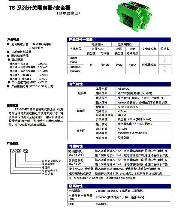 | TS200-EX | 開(kāi)關(guān)量檢測端隔離式安全柵 | NAMUR傳感器、機械觸點(diǎn)等開(kāi)關(guān)狀態(tài) | 繼電器輸出 | 2進(jìn)2出 | 五端隔離; 正反相控制設置 斷線(xiàn)檢測功能 |