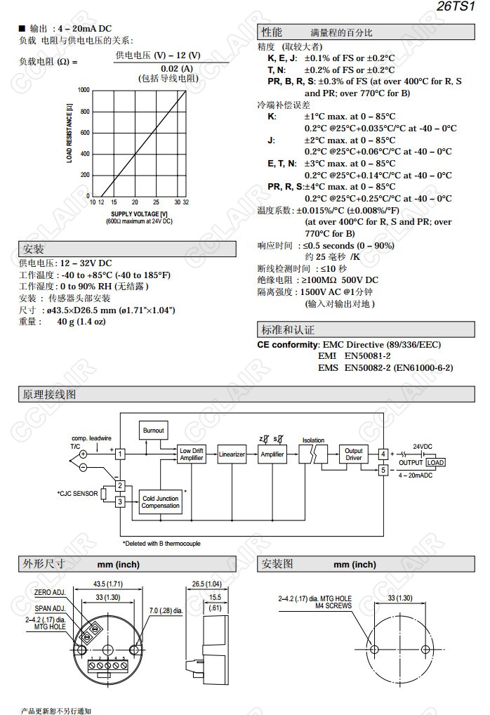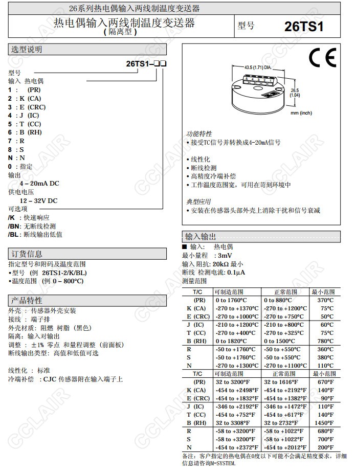 26TS1,26TS1-2/K/BL,26TS1-1,26TS1-2,26TS1-3,26TS1-4,26TS1-5,26TS1-6,熱電偶信號變換器(隔離)26TS1-7,26TS1-8,26TS1-N,26TS1-0