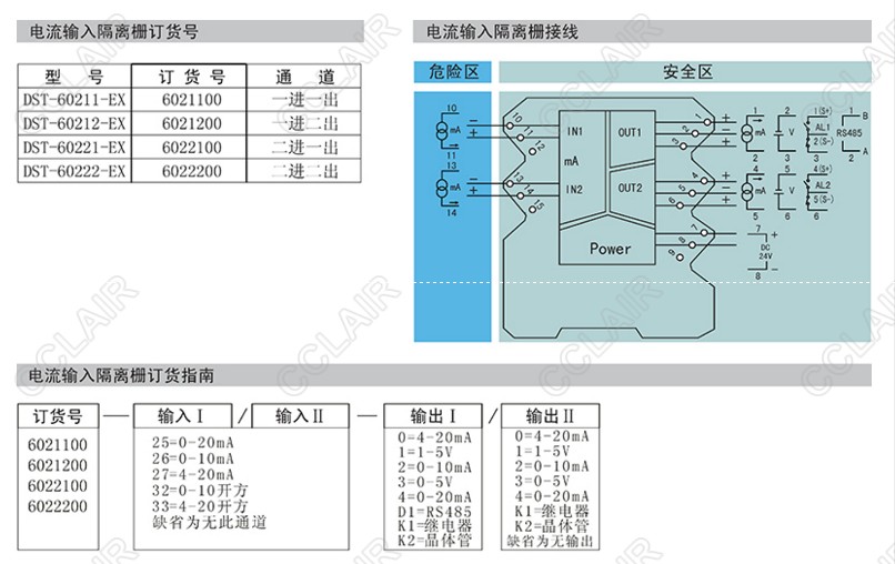 本產(chǎn)品給危險區的電流信號轉換成電壓、電流、RS485信號或開(kāi)關(guān)量信號,從危險區隔離傳送到安全區,該產(chǎn)品需獨立供電.