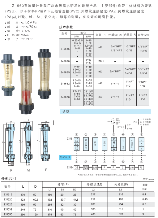 Z-560型流量計,主要部件:錐管材料 聚砜(PSU),浮子材料PP或PTFE,插管連接(PVC),外螺紋連接尼龍(PA6),內螺紋連接尼龍(PA66),對酸、堿、鹽、氧化劑、醇等的測量,有良好的耐腐性能。