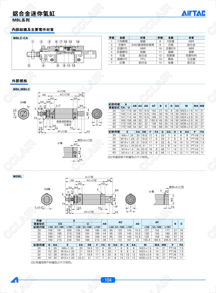 MBL20*10-CA,MBLC20*10-CM,MBLD20*10,MBLCD20*10,MBLCJ20*10,MSBL20*10-U,MTBL20*10-U,AIRTAC亞德客迷你氣缸