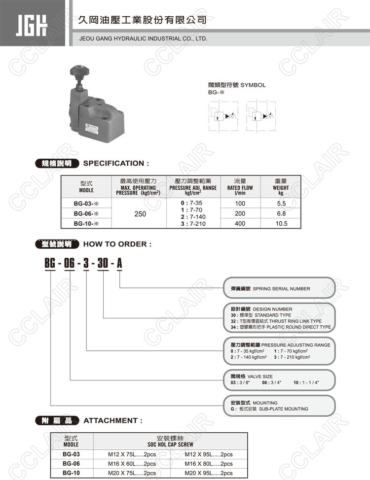 JeouGang臺灣久岡,先導式溢流閥BG-03-0-30-A,BG-03-0-32-A,BG-03-0-34-A,BG-03-3-30-A,BG-03-3-32-A,BG-03-3-34-A,BG-06-0-30-A,BG-06-0-32-ABG-06-3-32-A,BG-06-3-34-A,BG-10-2-30-A,BG-10-2-32-A,BG-10-2-34-A