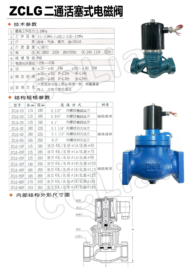 ZCLG-15,ZCLG-20,ZCLG-25,ZCLG-32,ZCLG-40,ZCLG-50,ZCLG-15F,ZCLG-20F,ZCLG-32F,ZCLG-40F,ZCLG-50F,ZCLG-65F,ZCLG-80F,ZCLG二通活塞式電磁閥