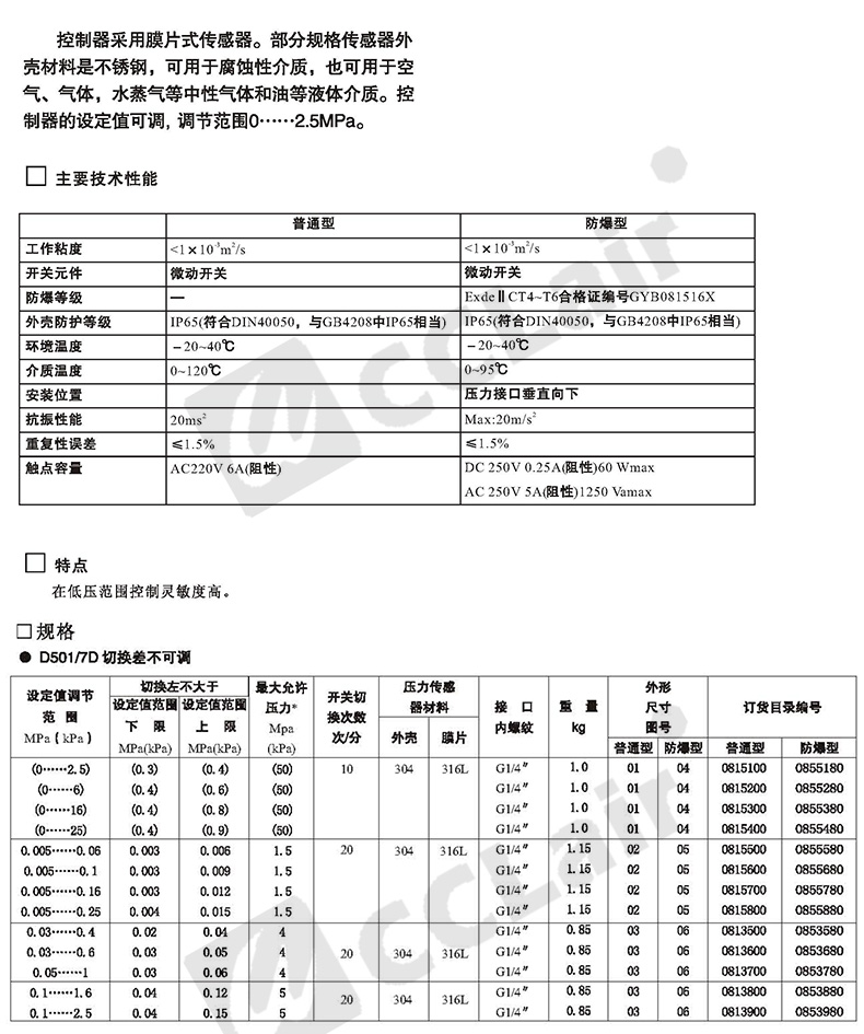 0815100,0813500,0815200,0813600,壓力控制器 普通 D501/7D切換差不可調 0815300,0813700,