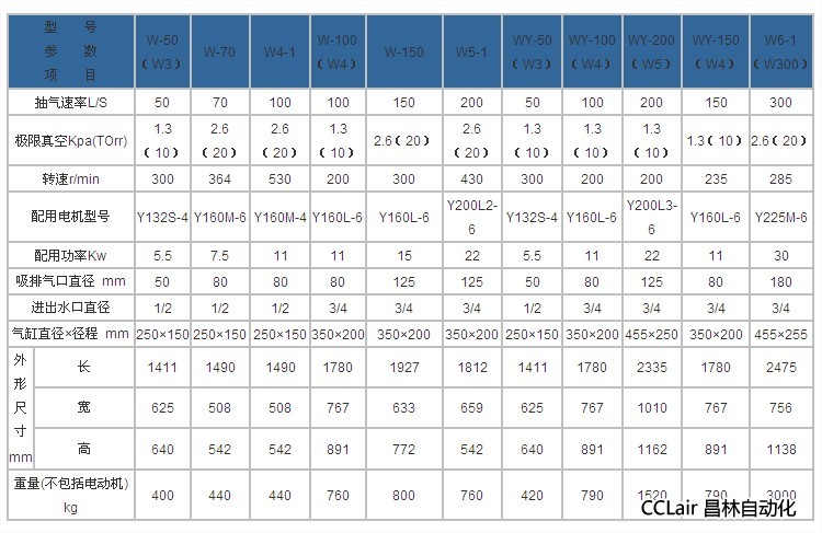 W-50(W3),W-70,W4-1,W-100(W4),W-150,W5-1,W6-1(W300),往復式真空泵