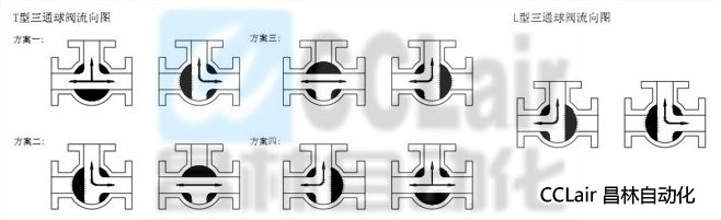 三通球閥分L型和T型,介質(zhì)流通方向見(jiàn)下圖。L型三通球閥適用于介質(zhì)流向的切換,能使相互垂直的兩個(gè)通道連通:T型三通球閥適用于介質(zhì)的分流、合流或流向 切換,T型孔道可以使三個(gè)通道互相連通或使其中兩個(gè)通道連通,三通球閥一般采用兩個(gè)閥座結構,亦可根據用戶(hù)要求采用四閥座結構。