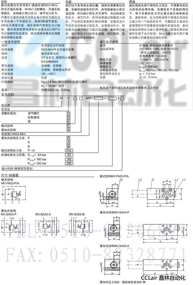 MV.FA03-P/A,MV.SA03-P,MV.SA03-A,MV.SA03-B,先導式減壓閥板式和疊加式結構