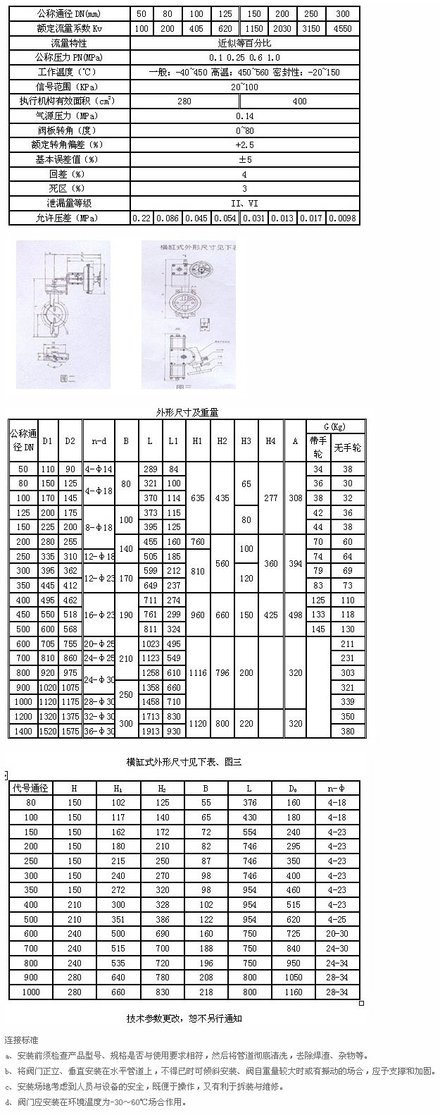 本系列產(chǎn)品有標準型、高溫型及密封型三種。產(chǎn)品公稱(chēng)壓力等級有0.1、0.25、0.6、1.0MPa,口徑由50mm至1400mm,泄漏量等級有II級和VI級,流量特性為近似等百分比。