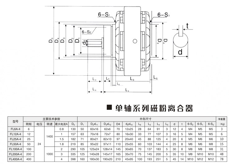 FL6K-4,FL12K-4,FL25K-4,FL50K-4,FL100K-4,FL200K-4,FL400K-4,單軸磁粉離合器