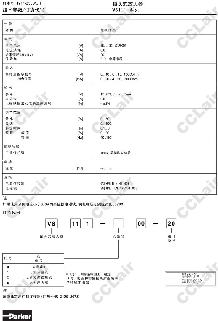 VS111-000-20,VS111-100-20,VS111-200-20,VS111-800-20,Parker插頭式放大器