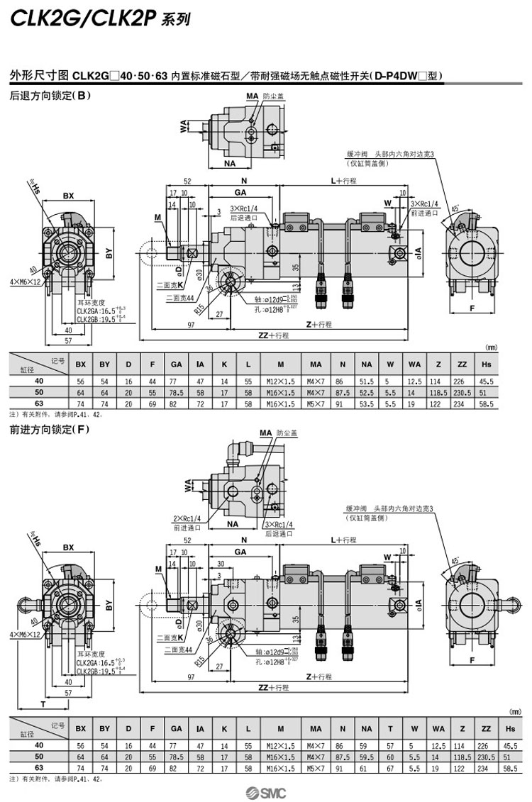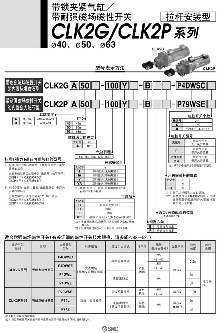 CLK2PA40-50,CLK2PA50-50,CLK2PA63-50,CLK2PB40-50,CLK2PB50-50,CLK2PB63-50,SMC帶鎖夾緊氣缸