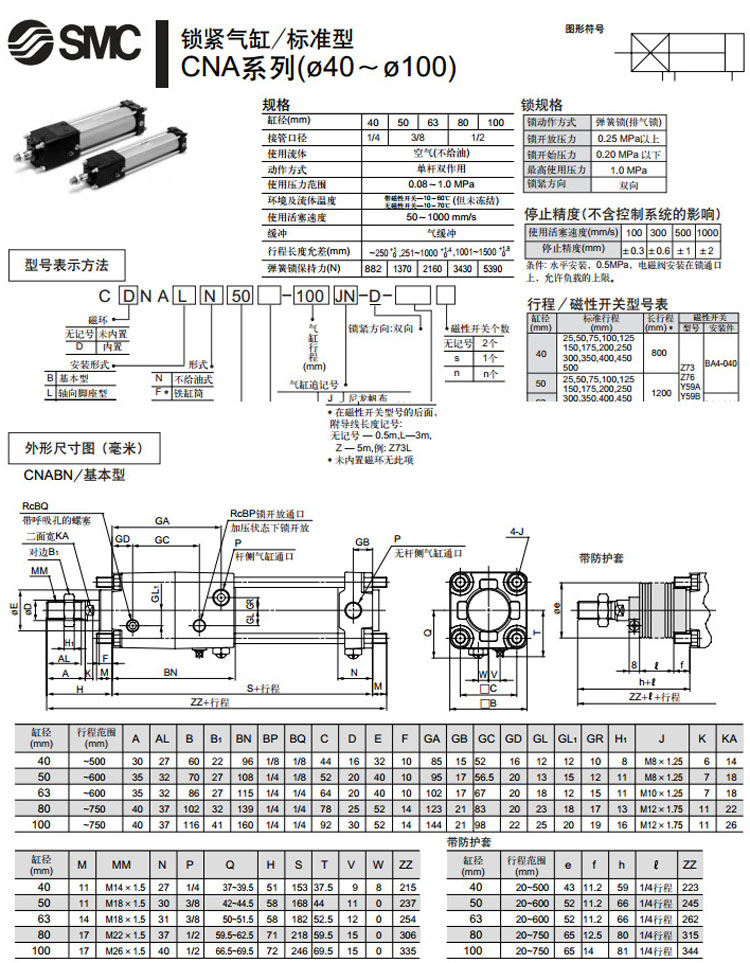 CNATN100-300,CNATN100-350,CNATN100-400,CNATN100-450,CNATN100-500,CNATN100-600,CNATN100-700,CNATN63-300,SMC標準型鎖緊氣缸
