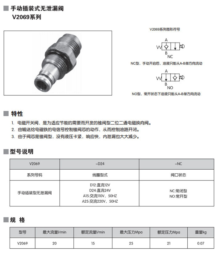V2069-D24-NC,V2069-D24-NO,V2069-D12-NC,V2069-D12-NO,V2069-A15-NC,V2069-A15-NO,手動(dòng)插裝式無(wú)泄漏閥