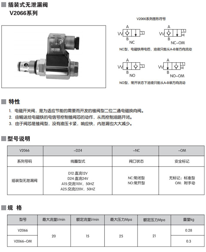 V2066-D12,V2066-D24,V2066-A15,V2066-A25,V2066-D12-NO-OM,V2066-A25-NC,插裝式無(wú)泄漏閥