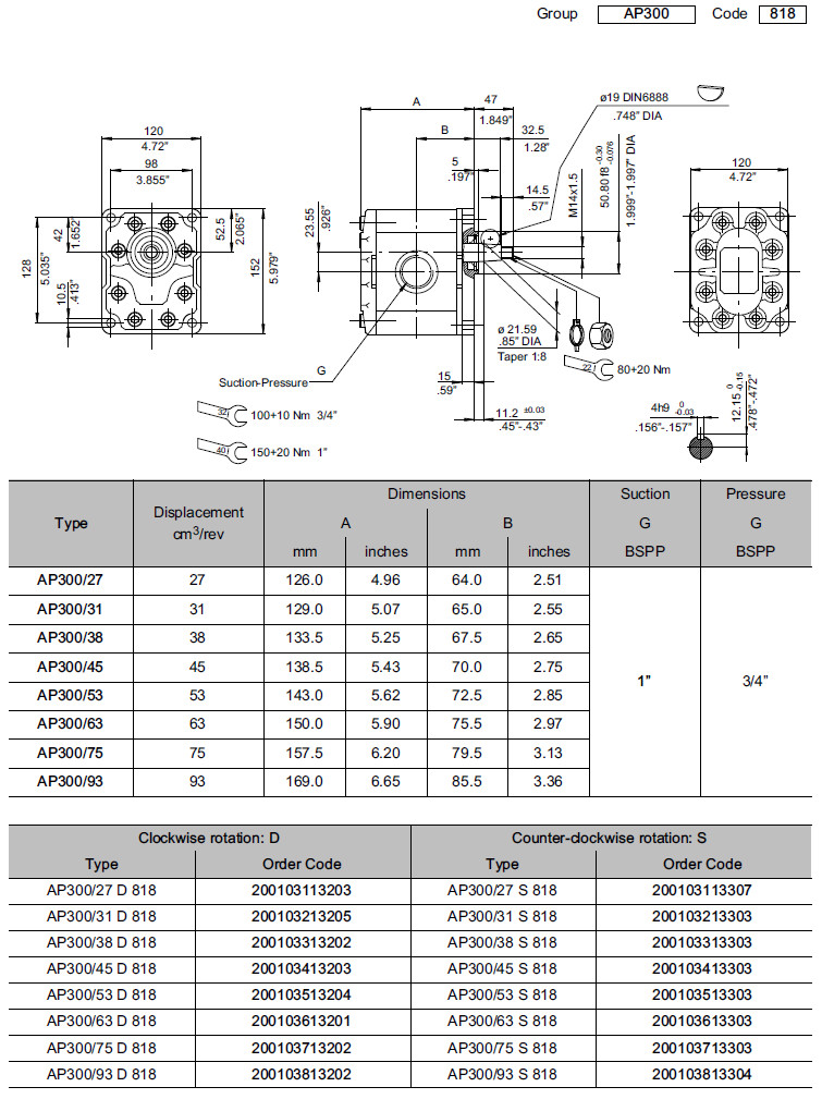AP300/27,AP300/31,AP300/38,AP300/45,AP300/53,AP300/63,AP300/75,Bucher外嚙合齒輪泵