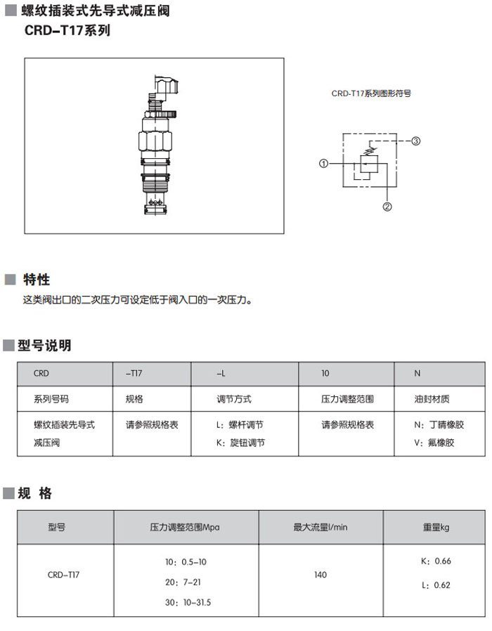 CRD-T17-L03N,CRD-T17-L10N,CRD-T17-L20N,CRD-T17-K03N,CRD-T17-K10N,CRD-T17-L30N,螺紋插裝式先導式減壓閥